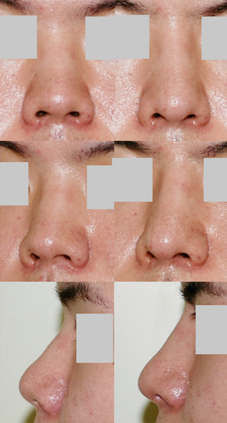 術後は鼻先がさがり、鼻柱と鼻翼の位置関係も改善しています。もともと鼻筋はあったのですが、鼻筋をよりはっきりして、鼻のスタート地点が頭側にあがり、鼻がより男性的になりました。