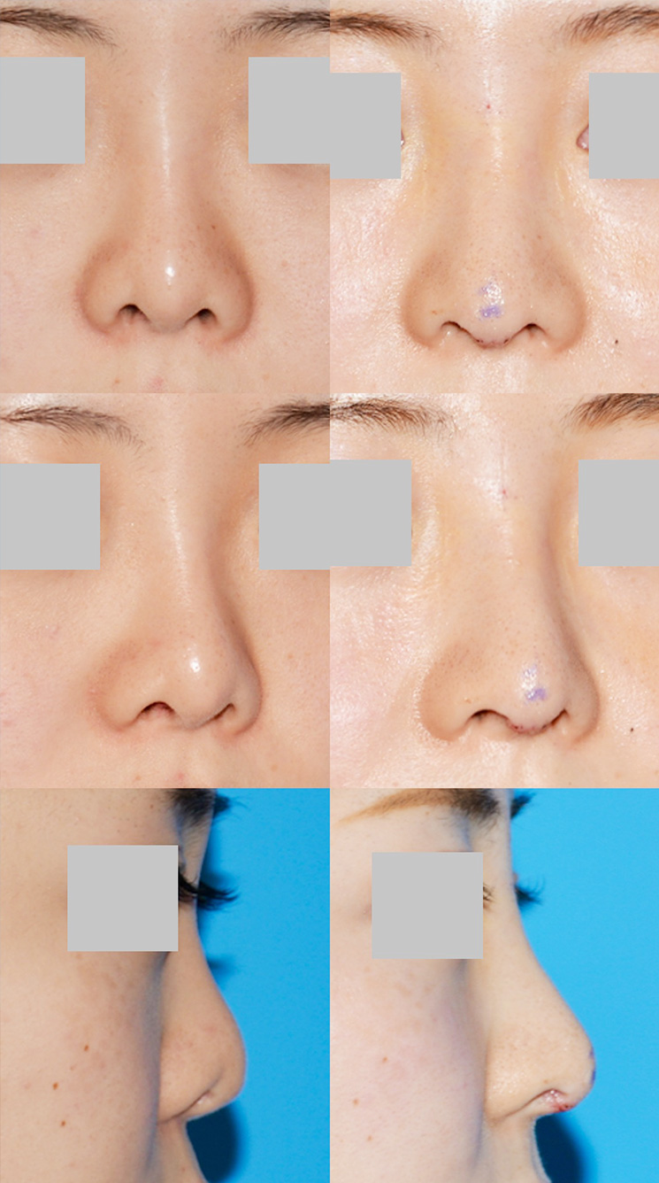 術式としては鼻尖を高くする手術として鼻中隔延長術が必須で、鼻尖に合わせてシリコンプロテーゼを加工しなければなりませんので、シリコンプロテーゼを新しいものに入れ替える(隆鼻術のシリコンプロテーゼ入れ替え)必要があります。