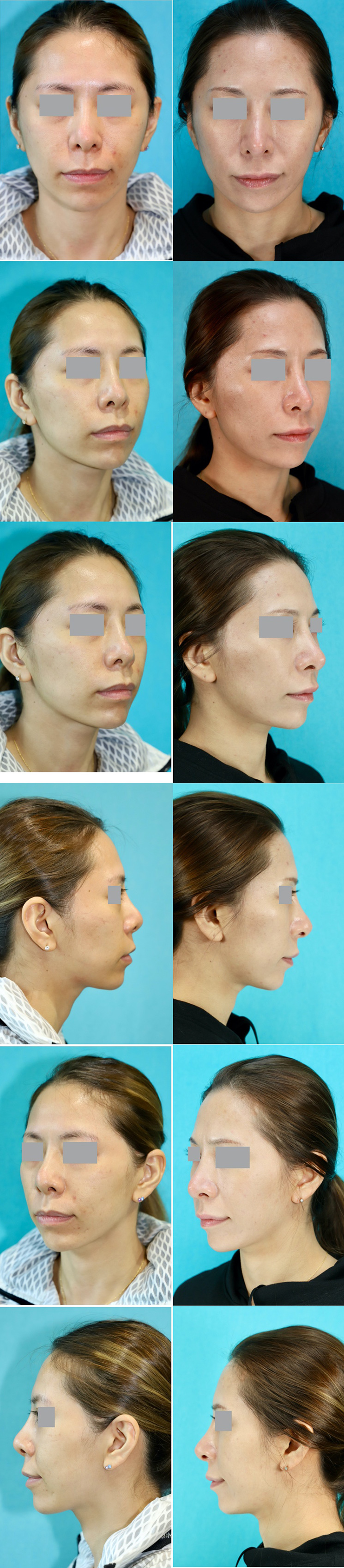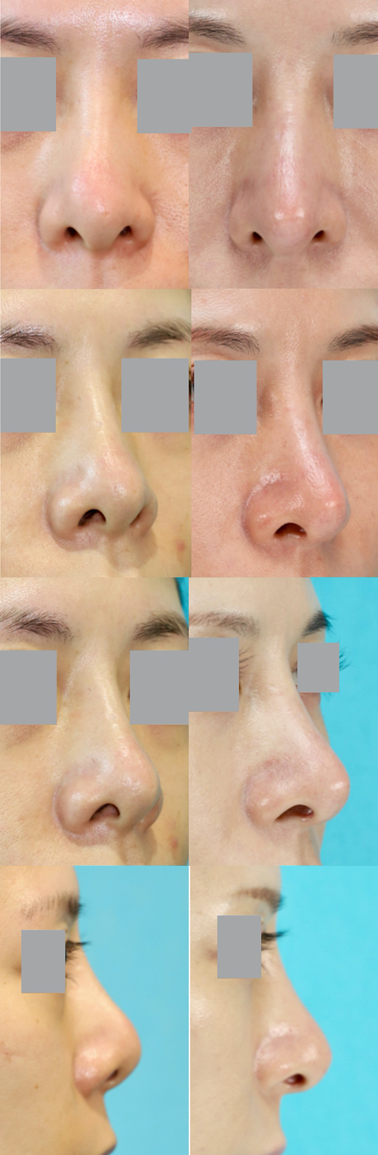 鼻先は丸く、アップノーズでしたので、鼻尖を細く下げるために鼻中隔延長術(耳介軟骨移植)、鼻筋のプロテーゼの長さ、厚みを変更するために隆鼻術(シリコンプロテーゼ入替え)を行いました。