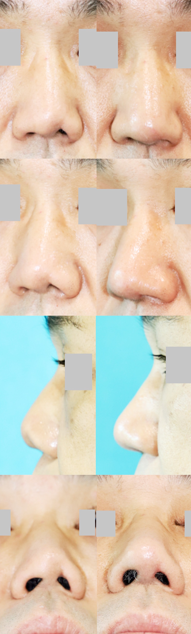 術後は鼻の穴(鼻孔)は完全に左右対称にはなっていませんが、だいぶ改善しました。鼻尖も高くなり、鼻尖部のバランスは改善しました。