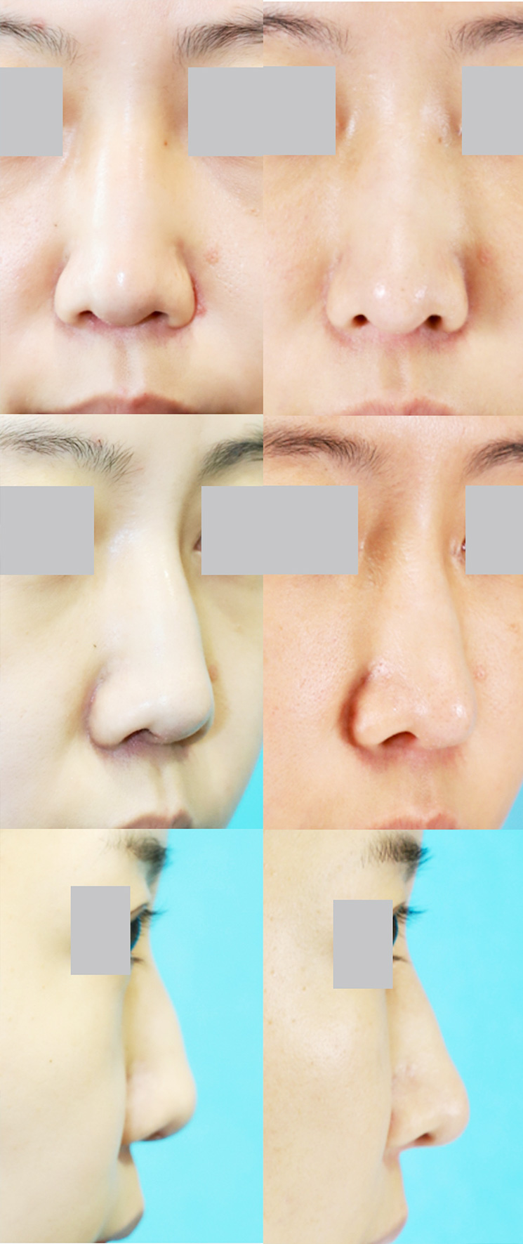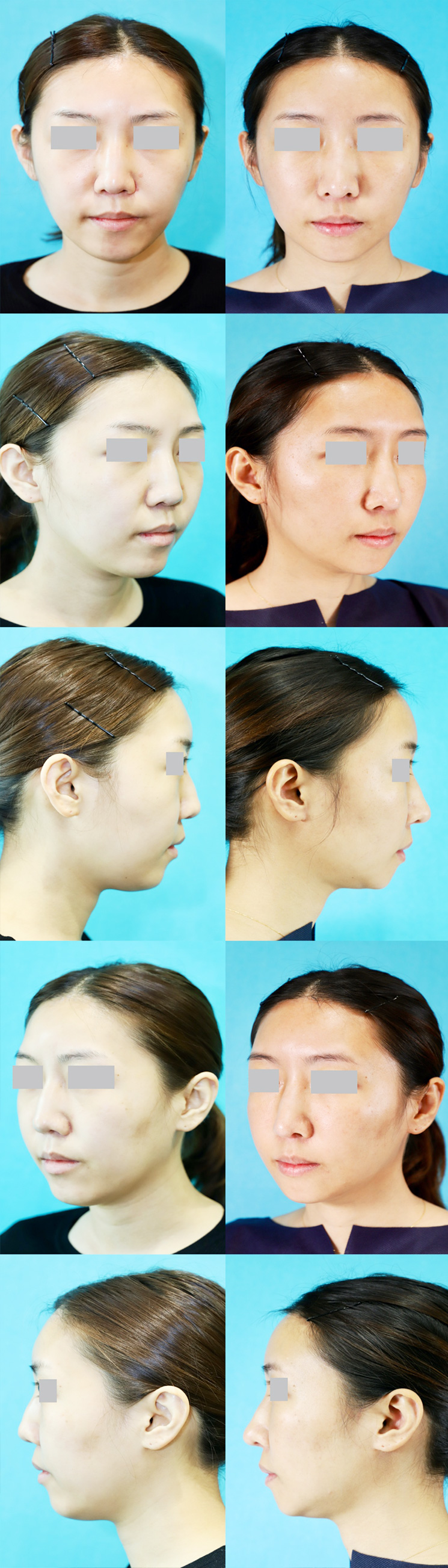 手術は顔の面長を改善させるためにアゴ削り、額とこめかみ、頬(ゴルゴ線やほうれい線)に注入、フェイスラインの脂肪吸引、鼻をツンと高く、細くみせるために鼻中隔延長術を行いました。