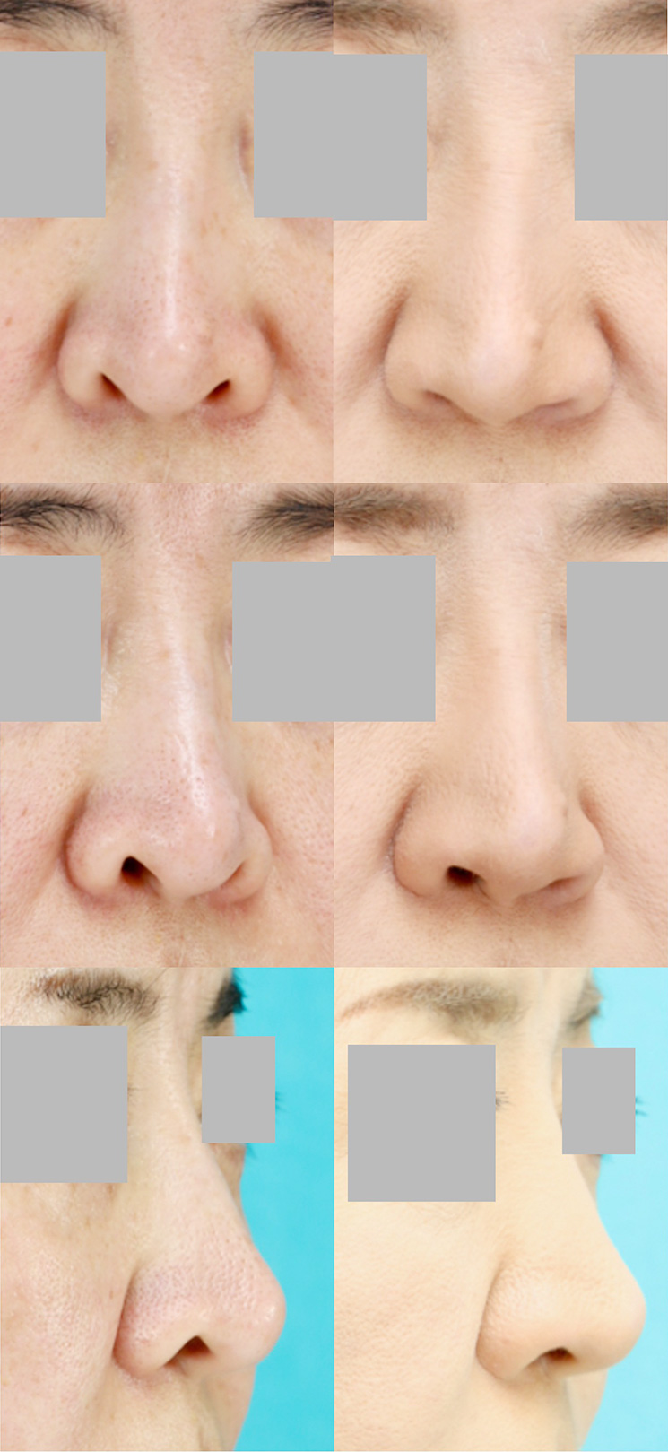 鼻尖を下げる(鼻中隔延長術)、鼻孔縁を下げる(鼻孔縁下降術)、鼻孔の幅を狭くする(鼻翼縮小術)などがあります。