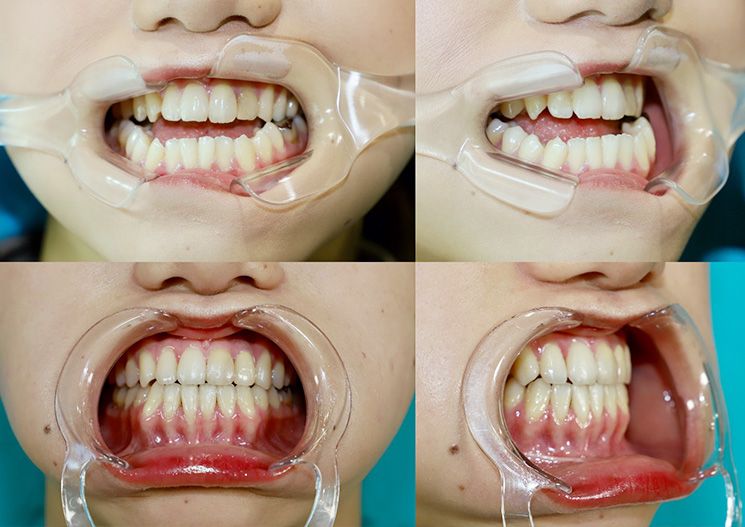 術後、ゴムでかみ合わせを維持して、矯正をおこないました。下顎の軽度前突感は残りますが、術前と比べると大きく改善しました。またかみ合わせも作れるようになりました。下顎単独でもある程度効果が期待できますので、ご相談下さい。