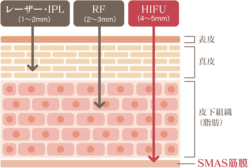 これまで、レーザーや高周波など外科手術をせずにたるみを改善する施術はありました。しかし、レーザーや高周波の場合、浅い所までしか届かず、皮膚の表面が最もエネルギーを吸収します。高い効果を得るために出力エネルギーを上げると、やけどや色素沈着のリスクが大きくなってしまいます。