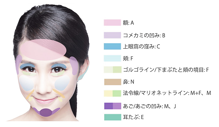 (①~④①額(ひたい)u2028②上眼瞼(上のまぶた)u2028③下眼瞼・頬・ほうれい線(下のまぶた~ほうれい線にかけて)u2028④あご⑤こめかみのうち1ヶ所に注入した場合はこの料金になります)