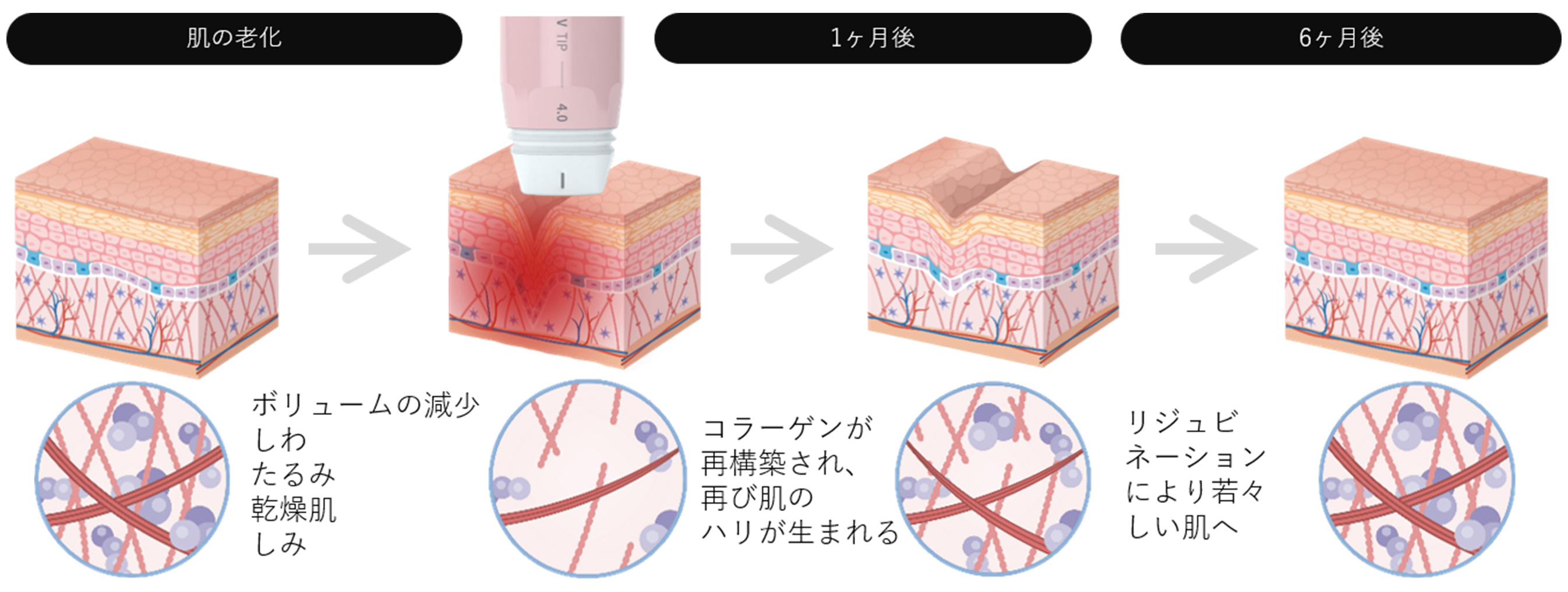 また、真皮層にある繊維芽細胞が刺激されることで、本来の治癒力や修復能力がさらに発揮されて新しいコラーゲンが生成されるので、美肌効果も感じられます。